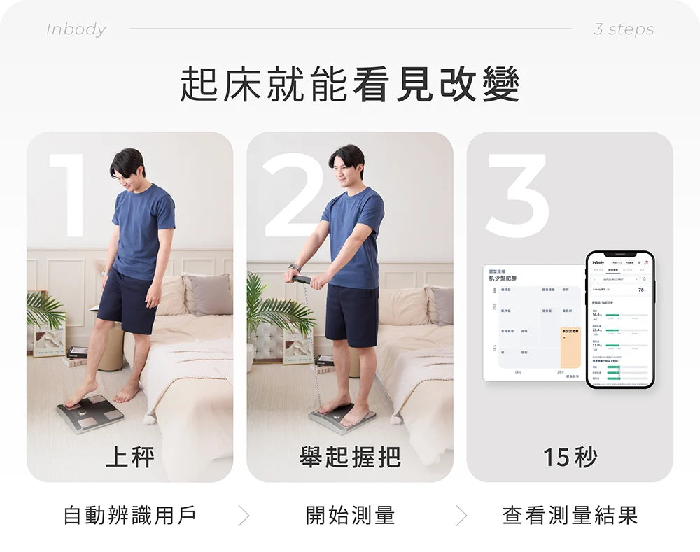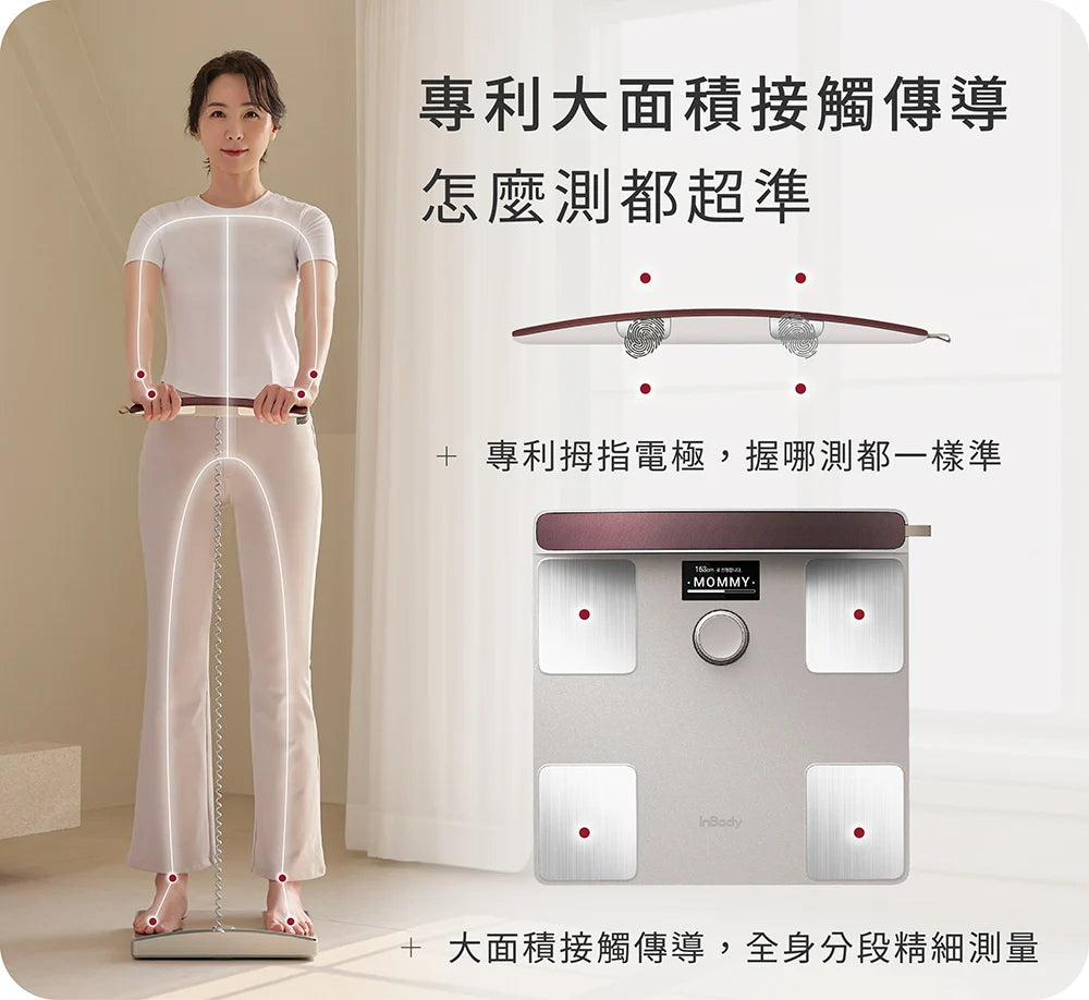 InBody品牌自主研發,累積28年技術實力,搭載獨家專利三頻BIA技術,不使用經驗值推算,15秒測出細微變化。 -